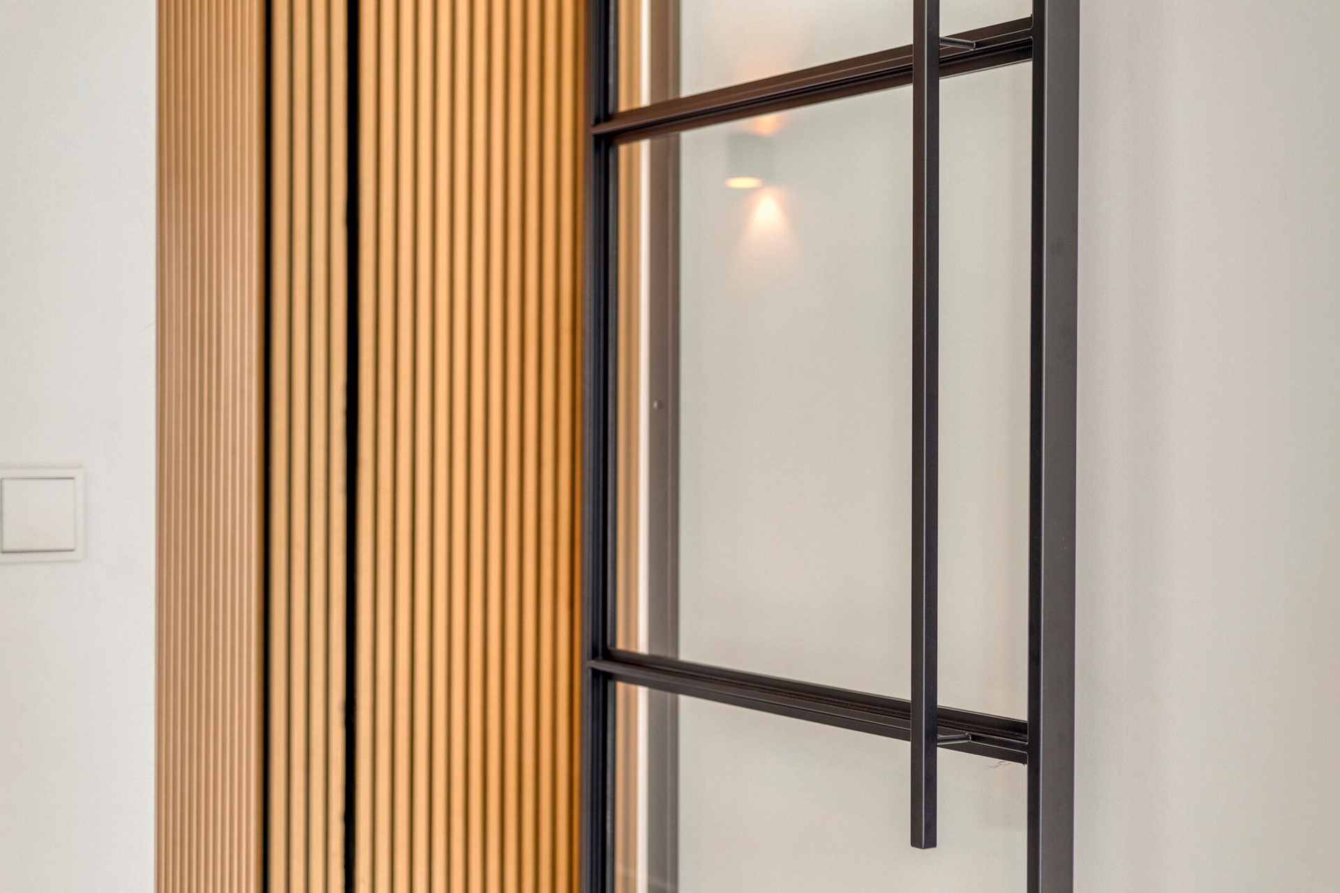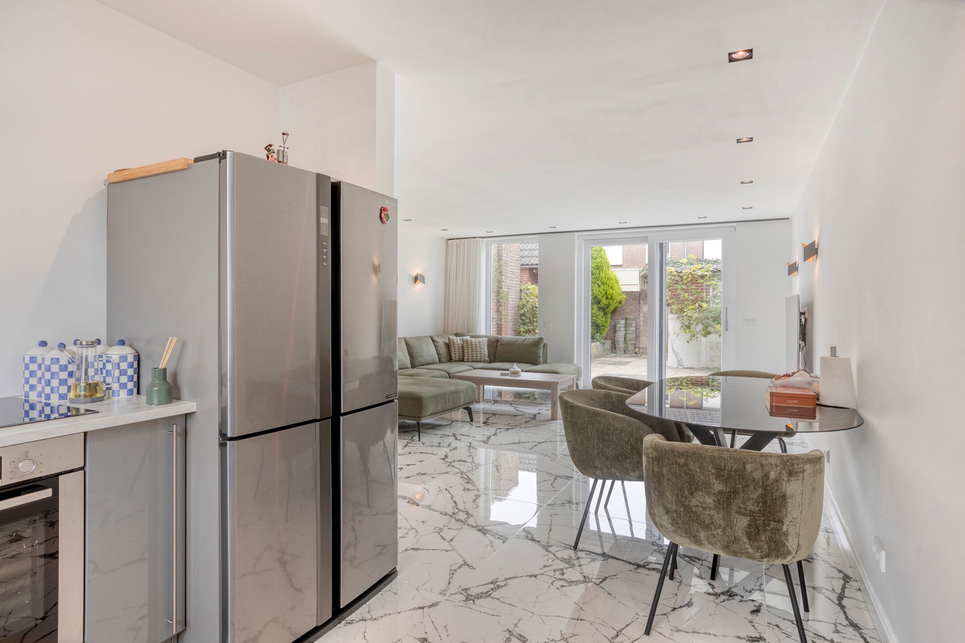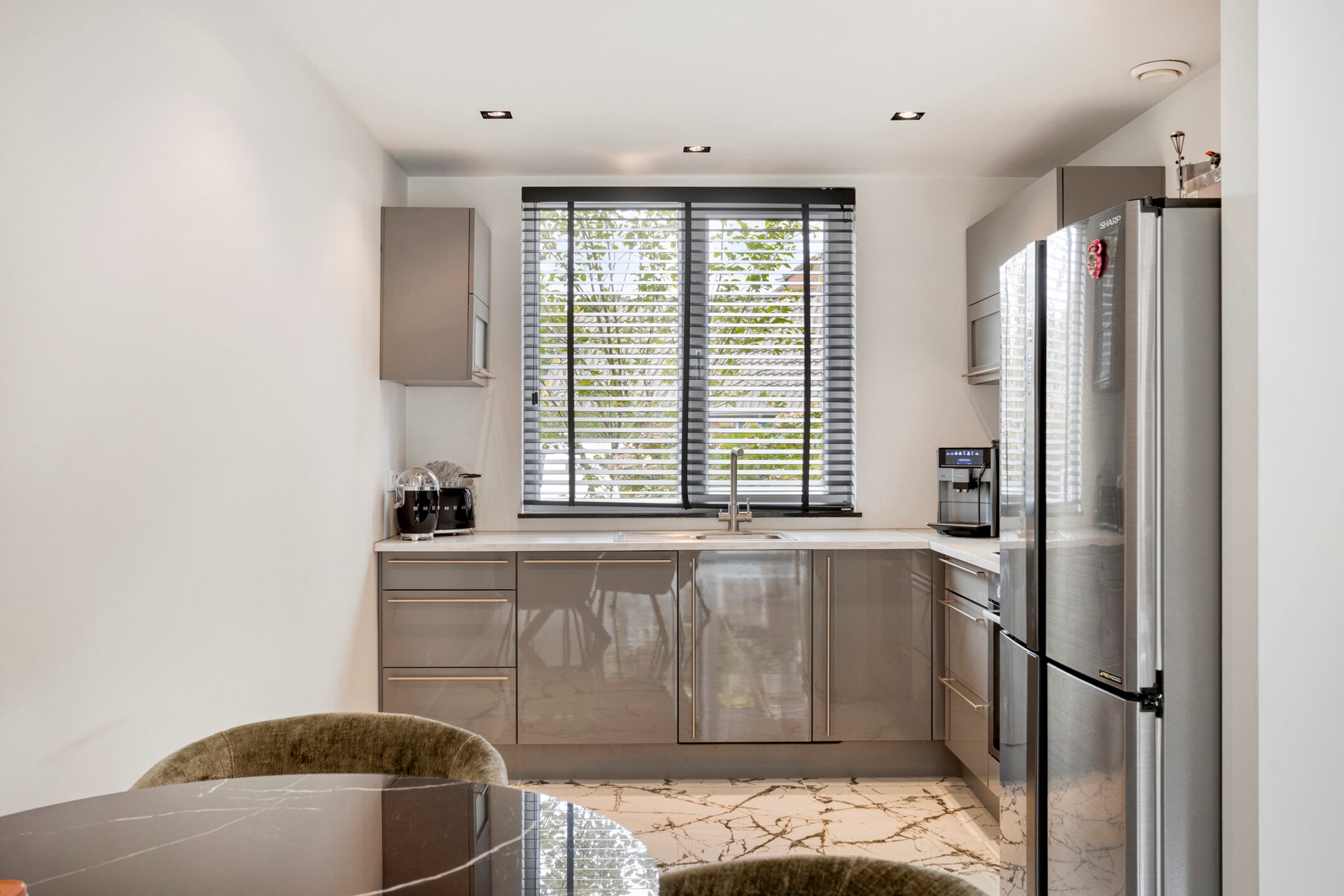 De moderne open keuken aan de voorzijde staat direct in verbinding met de woonkamer en zorgt voor een ruimtelijk geheel. De keuken is uitgerust met diverse inbouwapparatuur (zoals een inductiekookplaat, oven en vaatwasser) en sluit perfect aan bij de moderne en strakke afwerking van de begane grond.