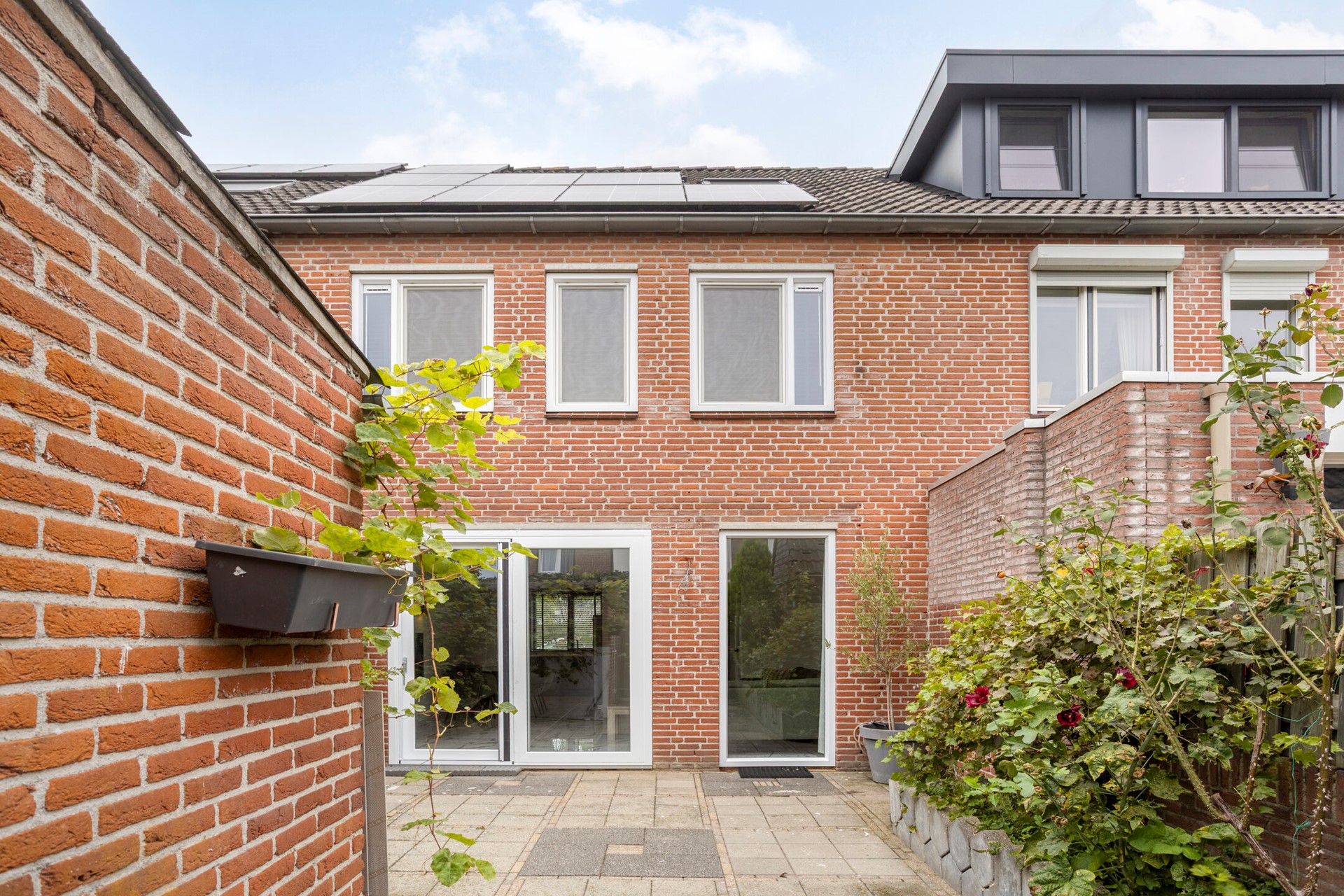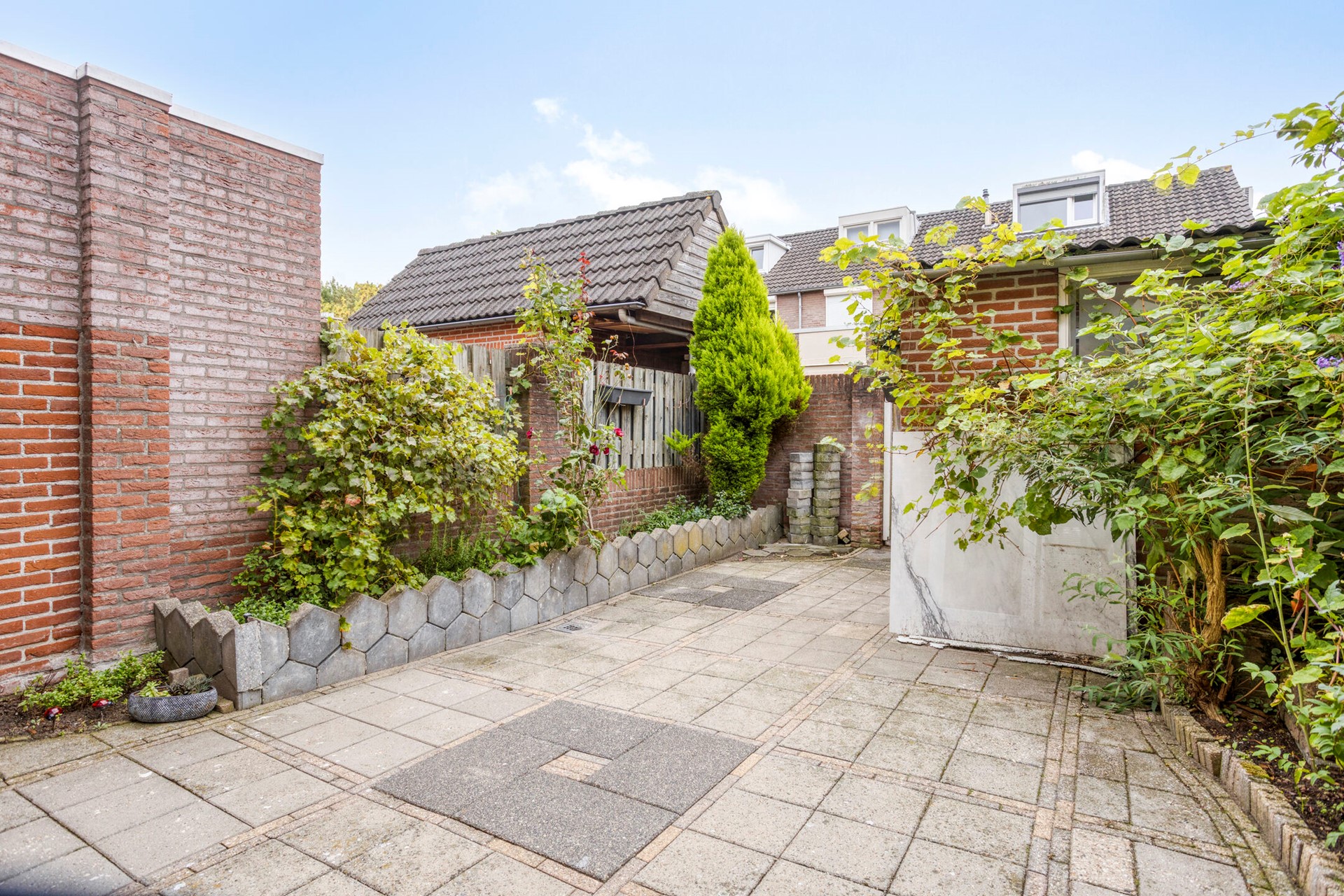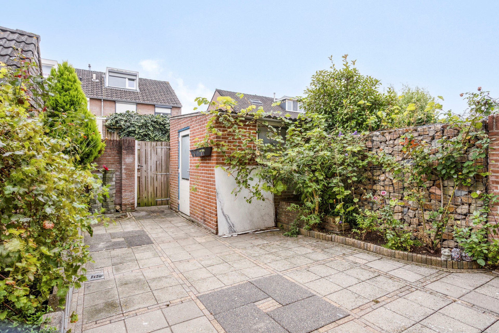 De tuin is onderhoudsvriendelijk aangelegd en dankzij de gunstige ligging op het zuiden kunt u hier tot in de avonduren van de zon genieten. Achterin bevindt zich een praktische stenen berging en via de achterom bereikt u eenvoudig de brandgang.
